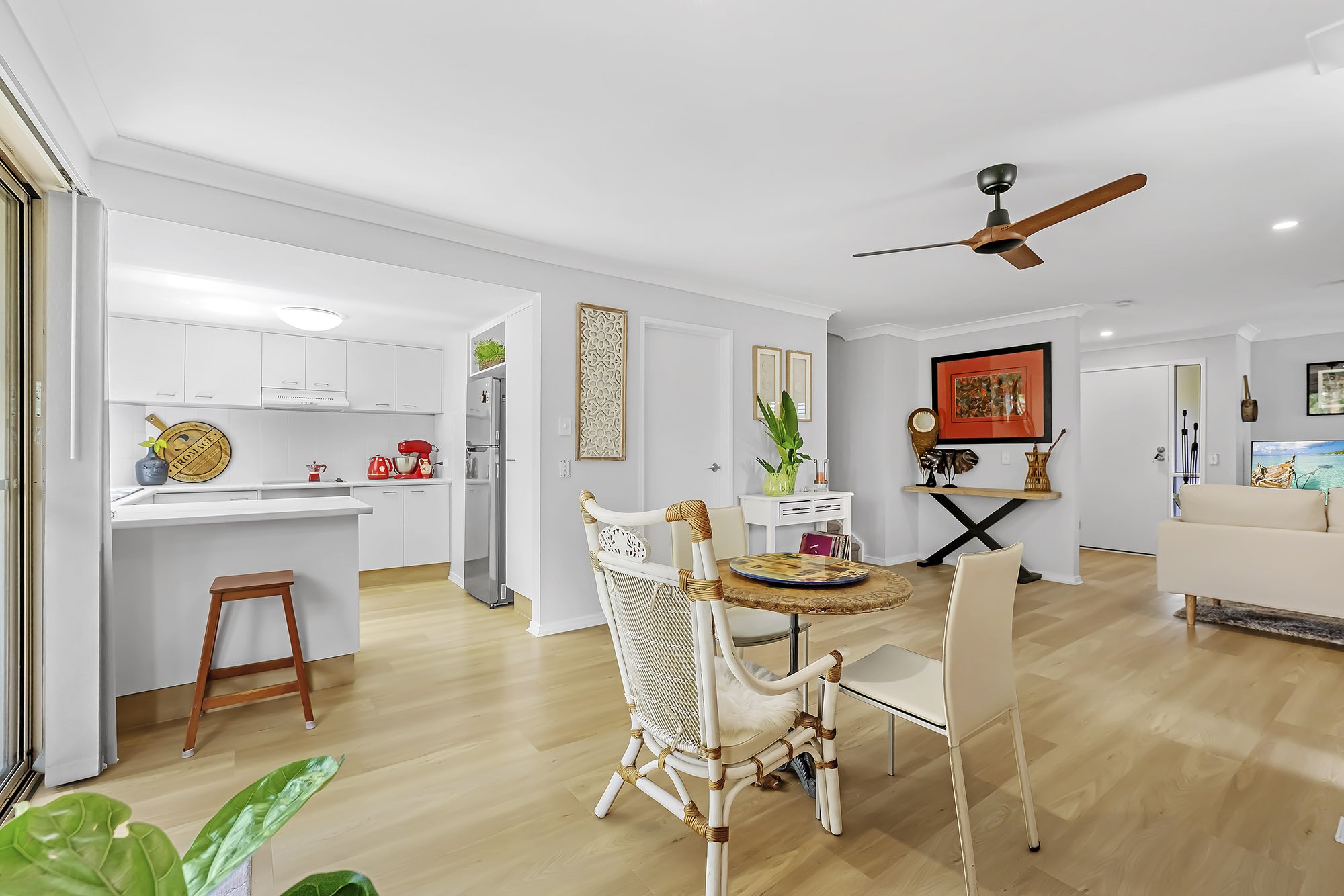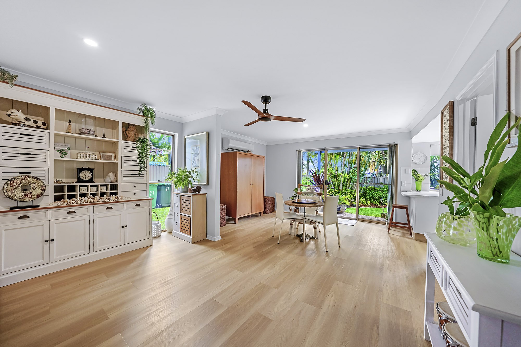 The ground floor greets you with a spacious, air-conditioned living and dining area featuring pristine wooden flooring. The beautiful kitchen, adorned with ample fresh white cupboards, overlooks the enchanting backyard. Taking the cooling inspiration of Bali, the meticulously designed garden has flourished within a year and promises further growth in the coming years—a haven for green thumbs and garden enthusiasts. Downstairs also accommodates the additional fourth bedroom, access to the garage, and an extra toilet conveniently located next to the laundry.