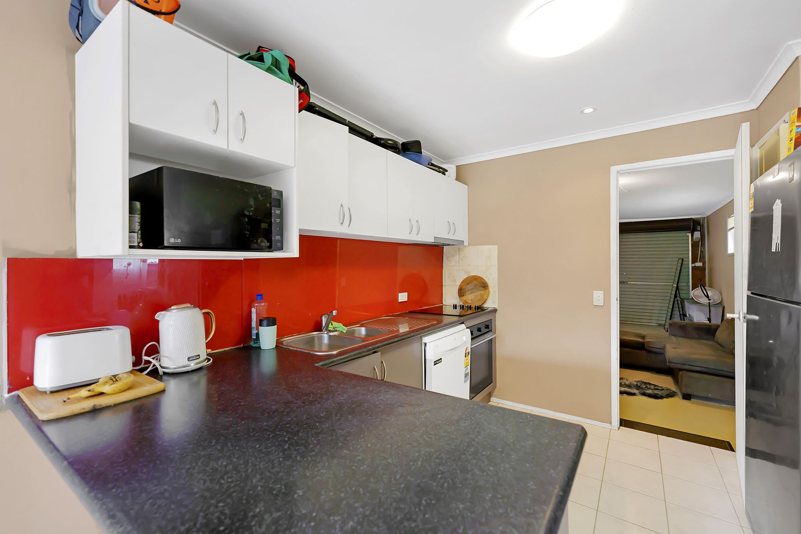 The kitchen provides stylish bench tops, white storage cupboards and a microwave recess. Appliances of an oven, dishwasher and Euromaid stovetop are also included.