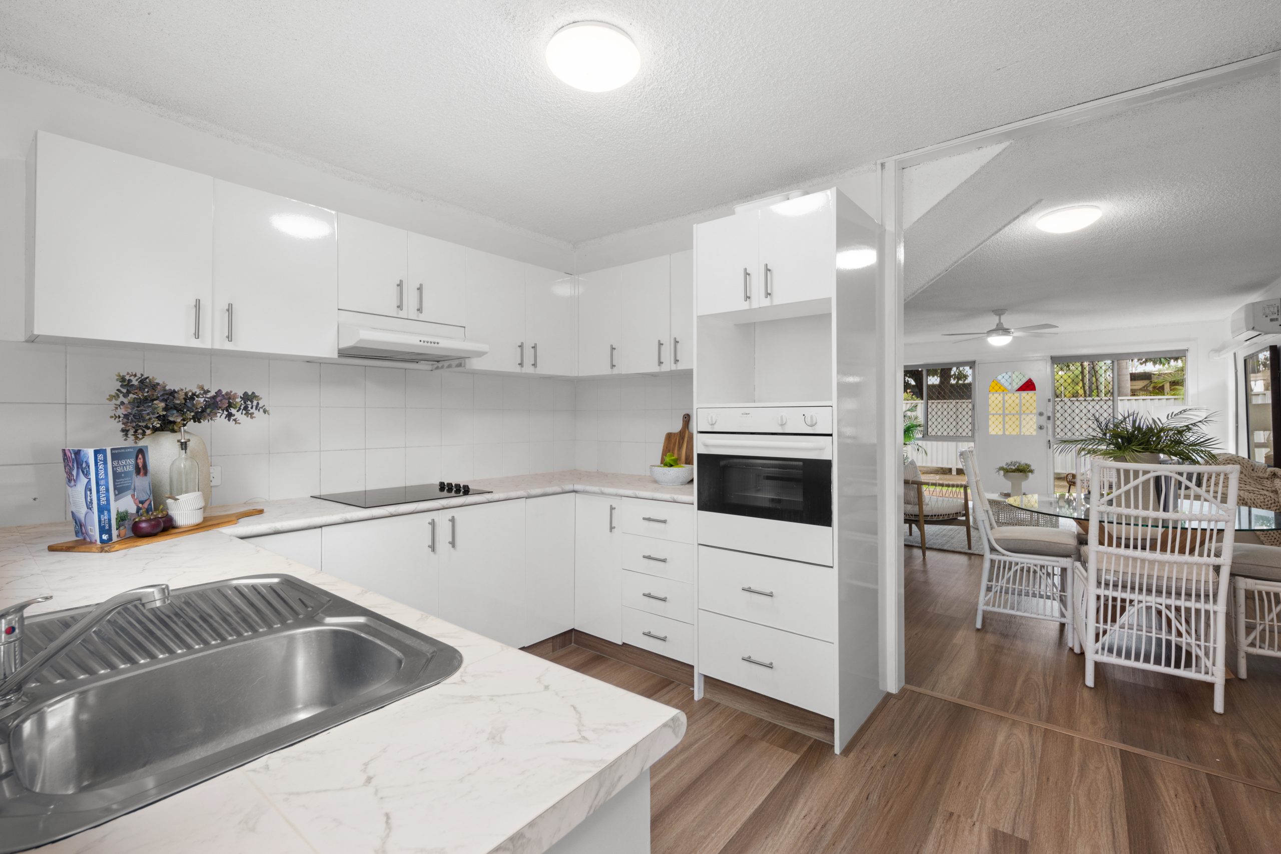 Step inside to discover a spacious open-plan living area with fresh wooden flooring, air-conditioning, and a bright, airy feel. The newly installed blinds and freshly painted walls create a modern and welcoming space. The unit’s unique coloured glass statement window in the front door adds a touch of character and charm, welcoming you home each day.